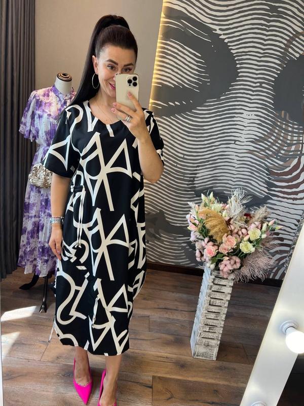 легкое и оригинальное платье прямого кроя, немного расширенное на бедрах, с круглым вырезом на груди и короткими рукавами, с первой минуты попадает в наши сердца и гардеробов, асимметричная платье со шнурками в виде декора выглядит стильно и современно, неровный крой подола создает интересный силуэт, а шнурки добавляют элемент игривости и оригинальности, такой наряд отлично подойдет для вечерних мероприятий или неформальных встреч, привлекая внимание своей уникальностью платье выполнено из приятного к телу коттона с эластаном с ярким и выразительным принтом размеры: 50, 52, 54, 56, 58 длина 122 см, объем груди по изделию от 116 см до 132 см, длина рукава от шеи 35-37 см, объем бедер по изделию от 128 см до 142 см код L 230824 D