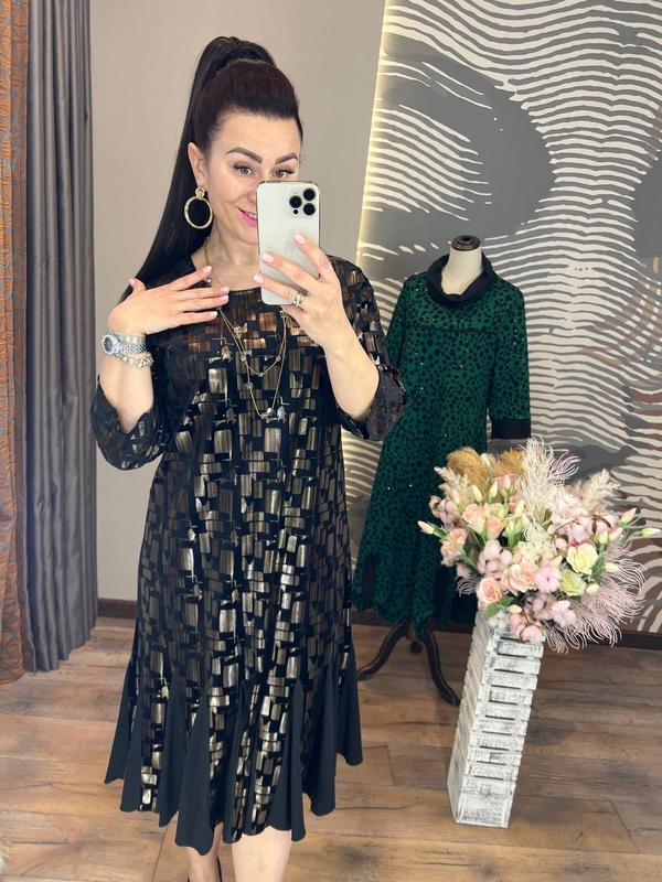 невероятно красивое, оригинальное платье свободного кроя с небольшим круглым вырезом на груди, рукавами длиной чуть ниже запоминающегося локтя будет отлично смотреться на вас и на праздники, и в будни платье шикарно смотрится и легко садится на девушек с разными типами фигур, оно выполнено из трикотажа на бархатной основе с эффектными золотистыми элементами и роскошной шифоновой рюшей по подолу размеры 50 52 54 56 58 длина 110-112 см, объем груди по изделию в зависимости от размера 112- 132 см, длина рукава 55-57 см код L 204
