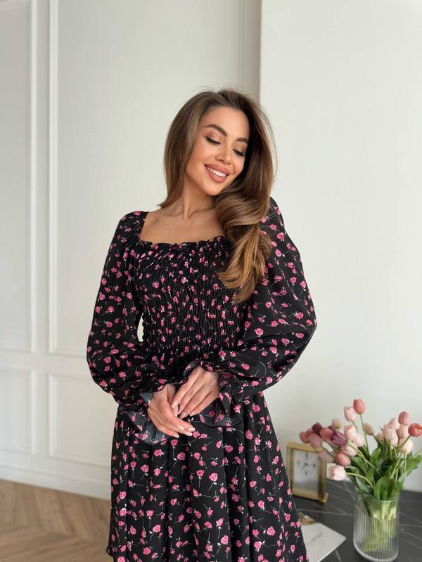 Модель 5627 Женское платье из софта Размерный ряд S,M,L,XL Тканина софт принт Цвет черный и белый С настрочной резинкой по груди и спинке, рукава и плечи также на резинке, благодаря чему регулируете платье Супер качество