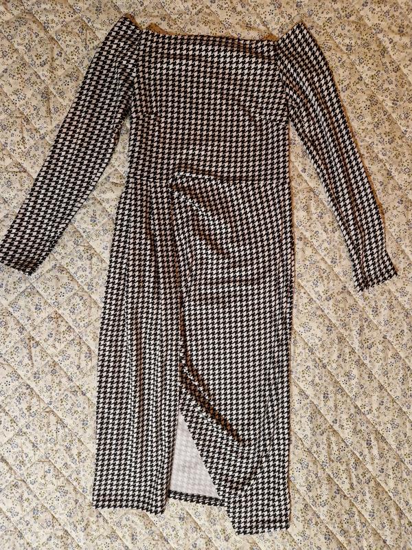 Платье со спущенными плечами и высоким разрезом (47 см), который частично прикрывается. Длина платья - 98 см, длина рукава - 55 см. В компоненте есть пояс из такой же ткани. Фактично нова, одягалась лише 1 раз на свято