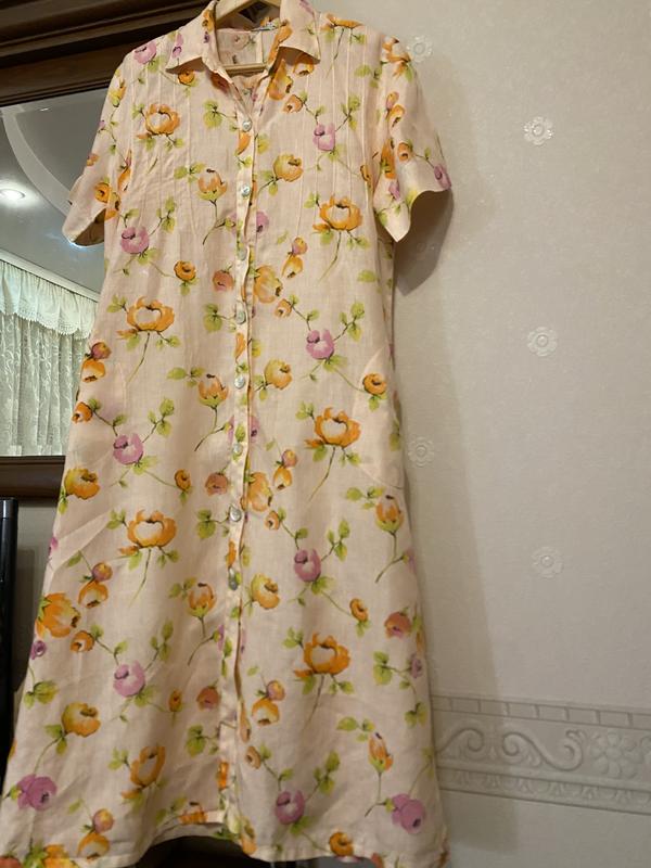 Летнее платье из 100% льна. Цвет свет розовый в цветах оранжевого и розового цвета с салатовыми мы листочками. Спереди застежка на пуговицы из ракушки. Воротник классический на стойке. В боковых швах карманы. Рукав короткий. Размер не указан. На мой размер 18 (44) в груди (115) не сходится, в бедрах впритик. Смотрите замеры: НОГрудей 52-54 см Талия 54 см Стегна 60 см Длина по спинке 119 см (за колено) Рукав 24 см Ширина рукава по бицепсу и по низу 22 см (указания, потому что достаточно широкий) Плече 13 см