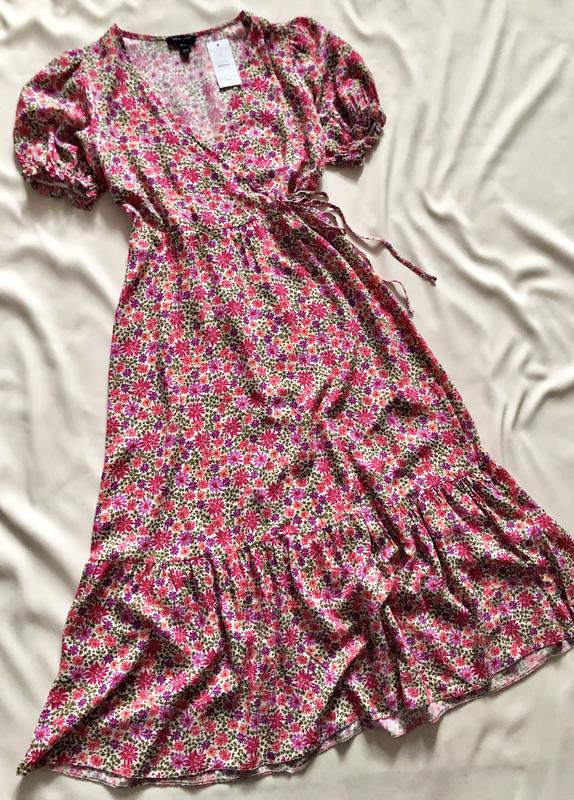 Сукня з тоненької тканини штапель ( 100% віскоза), в новому стані. Відрізна по талії , ззаду гумка, ліф з імітацією запАху. Довжина 124 см, Плечі 38 см, Ног. 53 см, Нот. 40 - 47 см, Нос. 57 см.