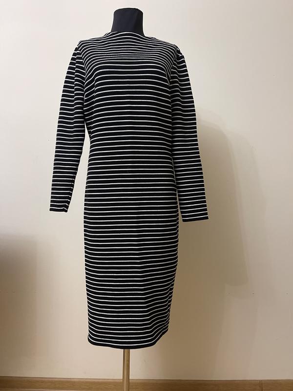 Платье - миди, в полоску. Размер 12/40. Ткань плотная, форму держит, немного тянется за счет эластана. Плечи 40,5 см, ПОГ 47 см, ПОТ 43 см, ПОС 47 см, длина 107 см, рукав 59 см. Толстых дефектов нет.