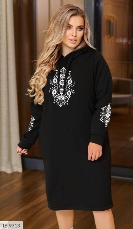 Платье IE-9725 Цена: 1090 грн Размеры: 42-44, 46-48 Ткань: три нити на флисе отличного качества Цвет: Черный, капучино, марсело, изумруд, Светлый хаки, графит, джинс, Темный хаки, Тиффани 42-44: ОГ 94 см. ОБ 98 см. Дл 103 см. 46-48: ОГ 102 см. ОБ 106 см. Дл 103 см. Оформление: шелкотрафаретная печать пластизильной краской. Ткань имеет среднюю растяжимость.