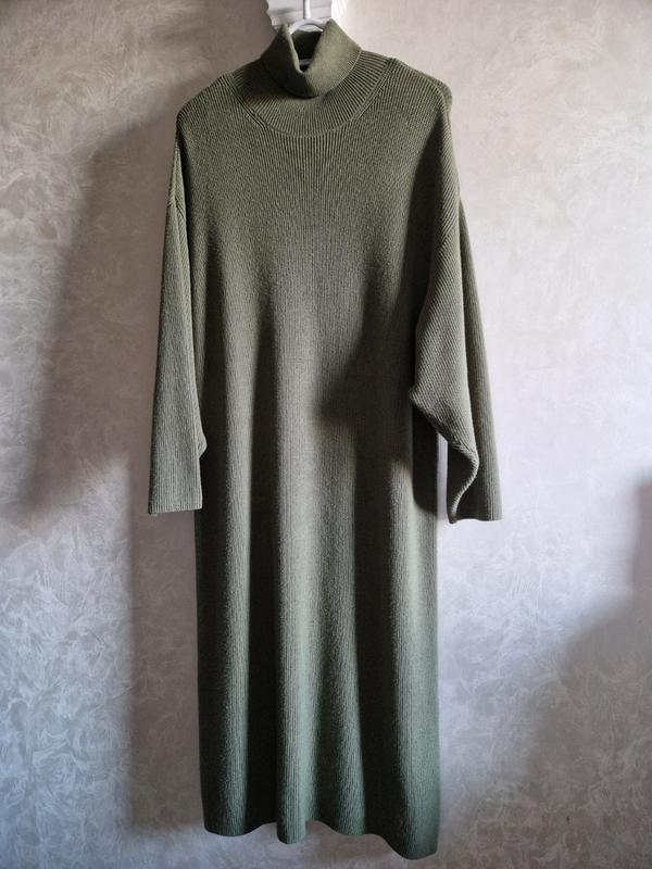 В'язана сукня оверсайз зі спущеною лінією плеча в оливковому кольорі, в розмірі M-L. В ідеальному стані. Заміри: Рукав від горловини 70 Під пахвами 57 ПОТ 56 ПО стегон 56 Довжина 114 Відправляю безпечною доставкою, або накладеним по передплаті за пересилку