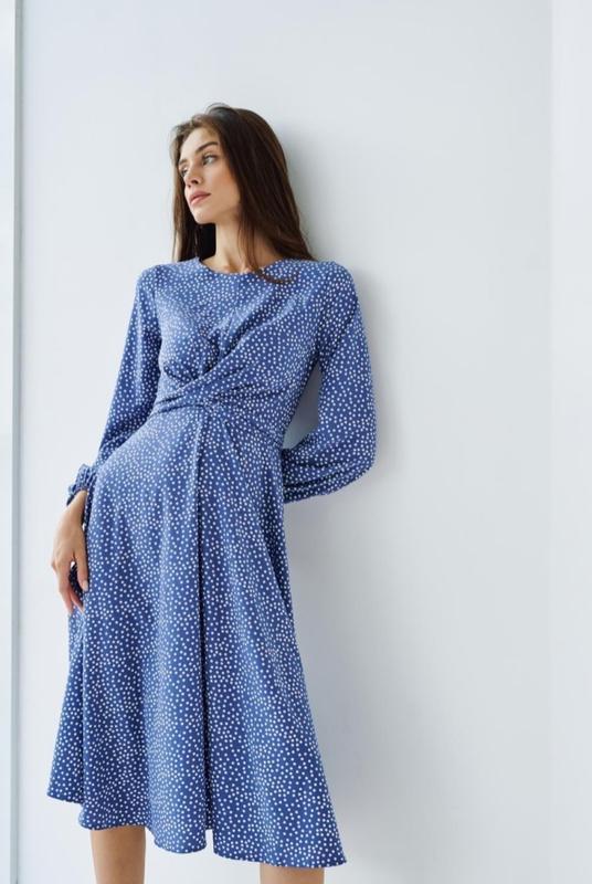 Платье украинского бренда ТМ “By Family Stolyarchuk”. Она подчеркнутой талией. Нежное платье с длинным рукавом, длинный рукав с фиксирующей резинкой и акцент на талии в виде перекрестных завязок, низ платья: солнце-клеш, миди длина и круглый вырез воротника.