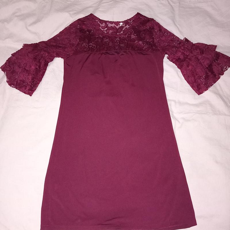 Симпатичное платье цвета бордо, сверху кружево и рукава также, размер 44, легкая и приятная ткань, одевались всего лишь один раз, состояние новой. Если будут вопросы, пишите.
