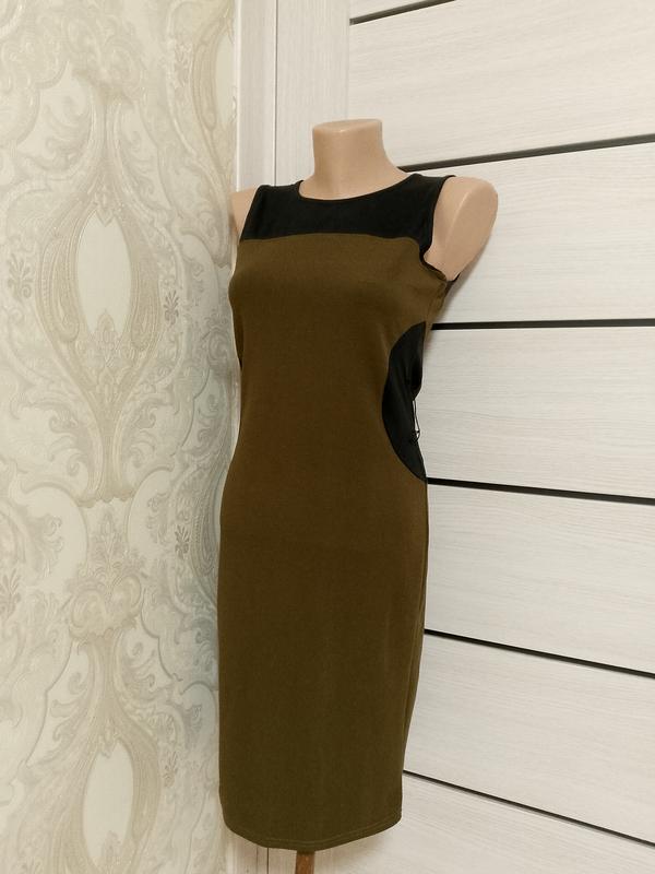 Платье карандаш к колену стретч/Tout Feu. Цвет зеленый (хаки) с черным. Размер указан М. Може бути на xxs,xs,s,m Линия груди 38 см, тянется больше до 48 см. Линия талии 34_35 см, тянется больше до 46 см. Линия бедер 40 см, тянется больше до 50 см Ширина внизу 38 см. Сзади длинная застежка-молния на всю длину, расстегивается. По бокам черные вставки + широкие нити-петельки.