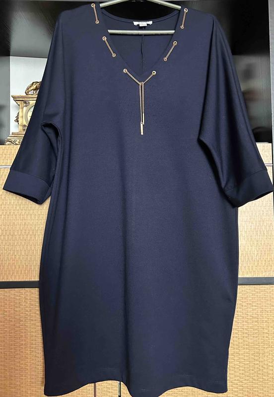 Платье «O’stin», размер XL, подходит на наш 48-50-52 р, в хорошем состоянии. Приятная к телу ткань, практически не мнется, на груди (через цепочка) малозаметные «катки». Рукава 3/4, фасон «летюча миша». Замеры: Ширина в области груди - 58 см, Длина платья – 95 см.