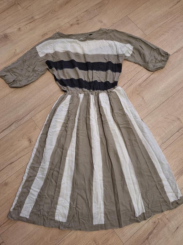 Легкое платье в полоску. 100% ацетат, нежный и приятный на ощупь материал. Есть подъюбник. Длина 110 см, от плеча до пояса 42 см, ПОТ 32 см (максимально тянется до 48 см). Есть шлейки для пояса и карманы. Рукав реглан, длина 47 см.