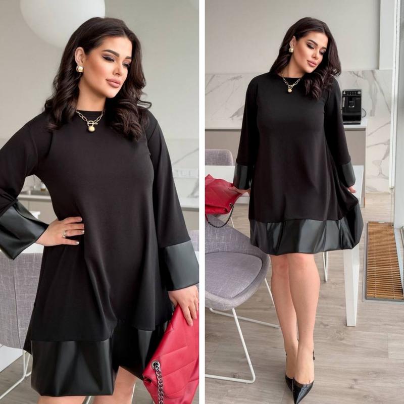 Сукня 820 грн 😍 Арт 0202253 Мод 1387 🌹Розміри: 48-50, 52-54, 56-58 ❤️Тканина: якісна двонитка що не просвічується та не скочується + еко шкіра 🌹Колір: чорний ✅Якість ідеальна ✅ВИМІРИ: 48-50 ОГ 110, ОТ 122, ОС ДО 150, довжина рукава від плеча 53, довжина виробу 98 52-54 ОГ 118, ОТ 136, ОС до 160, довжина рукава від плеча 55, довжина виробу 101 56-58 ОГ 126, ОТ 144, ОС ДО 170, довжина рукава від плеча 55, довжина виробу 104