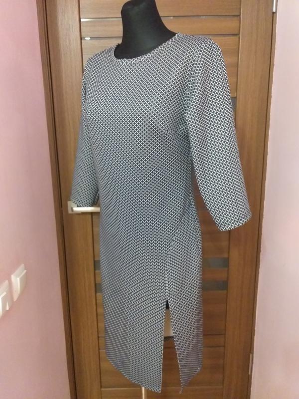 Очень качественный трикотаж.Как масло.Фасон удобный футляр, разрез,четочная рукав.Пог 47+,пот 44+,потреб 50+,плечи 40,рукав 42.Довжина платья от плеча 102. состояние б/у, без дефектов.