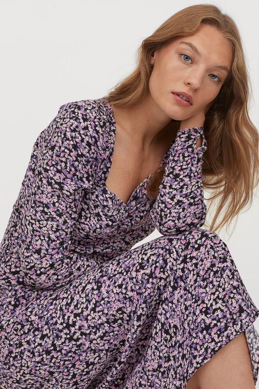 H&M Гарна сукня з довгим рукавом . Ефектне декольте . Сідає по фігурі . Квітковий принт . Натуральна тканина . Розмір -10 Заміри по запиту . Стан абсолютно як нове + додатковий ґудзик.
