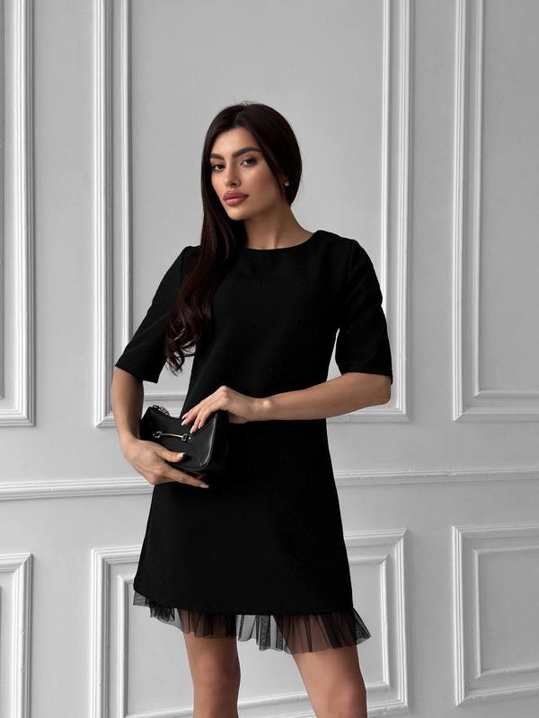 Женское платье Размерный ряд S,M,L,XL Платье состоит из двух элементов, верхняя основа из костюмноши ткани с камнями и потайной юбки из софта, низ которой сетка Очень классная и красивая модель Супер качество