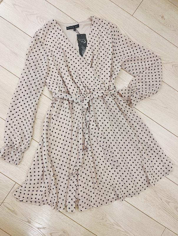 Новое платье. Ткань: шифре светло-бежевого цвета в черный горошек. Имеет подкладку. Фасон: на груди V-образный вырез за счет запаха на поясі резинка, юбка- полусолнце, рукав длинный без подкладки, на запястье резинка Размер Л (замеры на фото) Производство Турция.