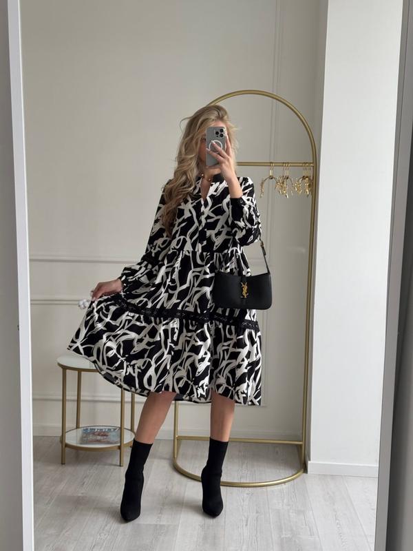🍒🆕В НАЯВНОСТІ 🆕🍒🆕 НОВИНКА 🆕🍒🆕 🔝⚡️🔝 Сукня 🔝⚡️🔝 Арт. SV 583 Ткань: евро-софт Цвет: черно-белый Размеры: S, M, L, XL, 2XL, 3XL, 4XL Цена : 1150 грн. Описание: Платье-трапеция свободного кроя. Модель с V-образным вырезом, рукава и воланы декорированы кружевом. (Заміри вказані на параметри)