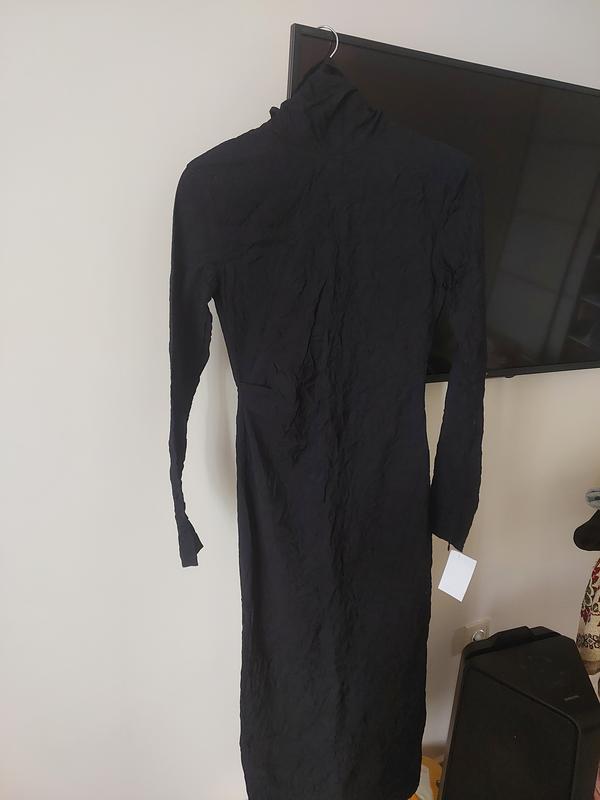 Дуже красива сукня,класична ,практична.тканина жата ,збоку складочки додають жіночності.Горливина стійка.Позаду замочок.Бомбезне.На всі випадки життя .Маленька чорна сукня.З біркою.