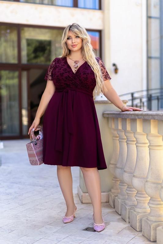 Сукня №6699. Ціна 1250 грн. Розмір: 50-52, 54-56, 58-60. Колір: електрик, зелений, бордо, синій . Тканина про-во Туреччини: креп дайвінг, сітка флок . Сукня прикрасить будь-яку фігуру і зробить Ваш образ чарівним та романтичним! Ідеально підійде для урочистостей, так і для повсякденного носіння, і обов'язково стане вишуканою прикрасою Вашого гардеробу. Перед сукні з імітацією запаху. До сукні додається знімний пояс із основної тканини. У такій сукні будь-яка жінка зможе відчути себе справжньої леді та королевою вечора, ця сукня здатна надати жінці ніжності, легкості та елегантності. Виміри: РОЗМІР 50-52: Сукня: дв. 105 см, рукав 28 см ОГ-105 см, ОТ-112. РОЗМІР 54-56: Сукня : дв. вир. 106 см, рукав 29 см. ОГ-118 см. ОТ-120 РОЗМІР 58-60: Сукня : дв. вир. 107 см, рукав 30 см. ОГ-124 см. ОТ-126 см.