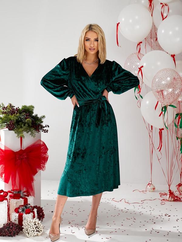 Платье платье миди с длинным рукавом декольте на запах мраморный велюр зеленый