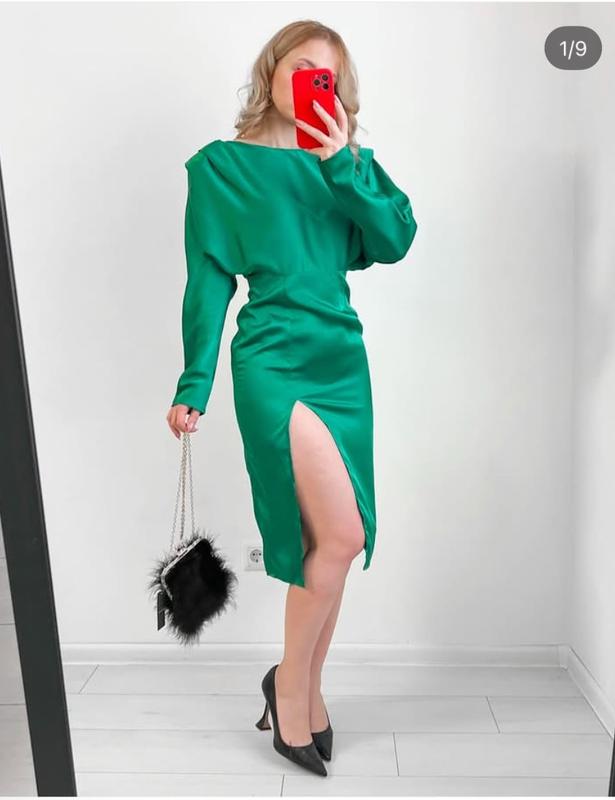 смарагдова сатинова сукня 🏷️680грн размер S полиэстр полуобхват: грудь-свободно (47см) талия-35см бедра-45см(тянется до 50см) рукав-65см Длина платья-112см