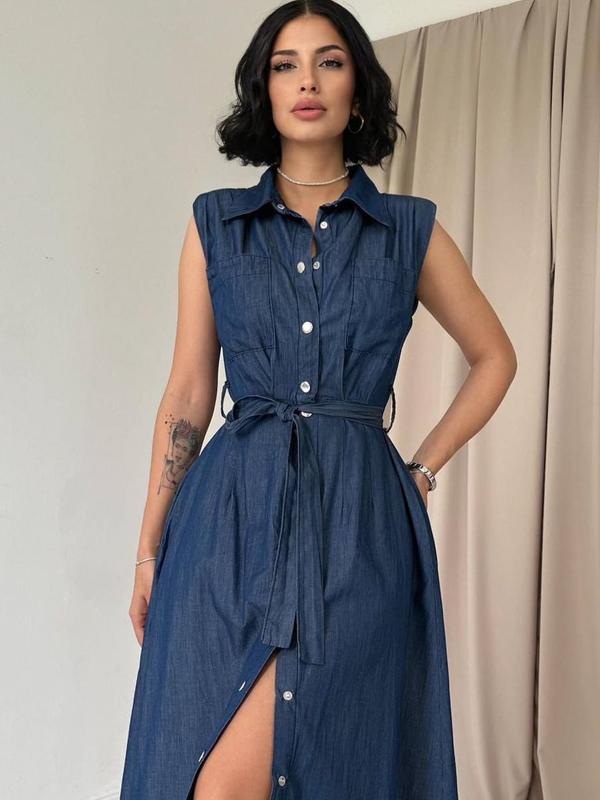 Джинсовое платье-рубашка на кнопках с поясом без рукавов