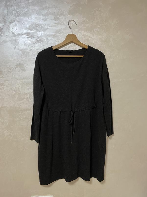 Трикотажна сукня бренду COS довжиною до коліна з довгим рукавом з цікавим кроєм в області таліі, затягується на куліску. Розмір на етикетці S, але добре підійде і на M. Колір темно- сірий. Довжина 90 см, напів обхват талії 58 см, напів обхват під рукавами - 60 см.