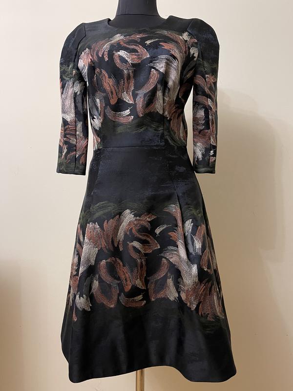 Сукня темно зеленого кольору 10 розміру. Бренд Mulberry. Нова, з цінником 1160 євро до знижки. Плечі 38 см, ПОГ 39 см, ПОТ 33 см, ширина спідниці 63 см, довжина до талії 39 см, загальна довжина 92 см, рукав 37 см. Щільний шовк, що тримає форму, підкладка поліестер. Є запах обробки, потребує прання.