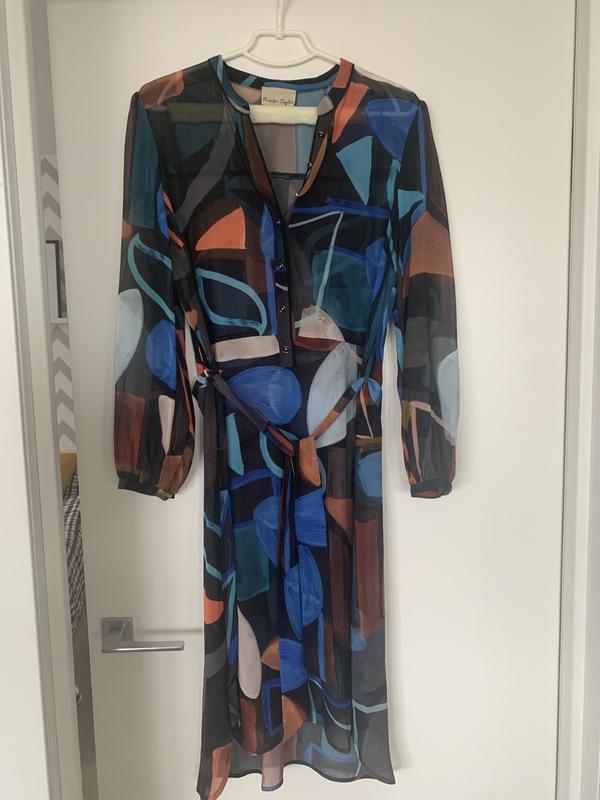 Платье британского бренда Phase Eight, полупрозрачное, с абстрактным принтом, рубашечного кроя. Размер британский -14. Состав: 100% полиэстер ( ткань приятная на ощупь) Замеры: длина по спинке 112 см ( впереди немного короче), длина рукава 60, плечо 12, от плеча до плеча 41, полуобхват талии 47 (имеется пояс).
