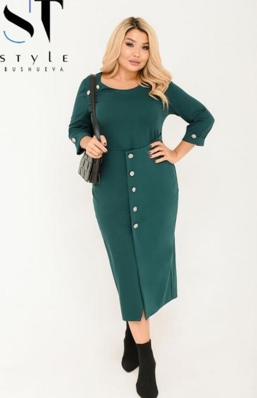 Плаття темно-зеленого (пляшкового) кольору, без бирок об склад тканини. Тканина з гарною розтяжністю (+8-10 см), на дотик: 70% трикотаж + 30% поліестер. Рукав 3/4 з невеликим поворотом, закріплений залізною ґудзикою, праворуч на грудях такі ж ґудзички та по спідниці. Спідниця плаття зроблена на захід, ззаду на спідниці невеликий розріз, ґудзики на спідниці не розстібаються, ззаду плаття на спині застібається на змійку. Якщо потрібні додаткові фото — пишіть. Заміри плаття: довжина виробу — 120 см, рукав — 45 см (3/4), НО грудей — 54 см (+тягнеться), НО стегна — 56 см (+ тягнеться). Плаття в ідеальному стані, одягалася один раз, р/р 52-54 - 56