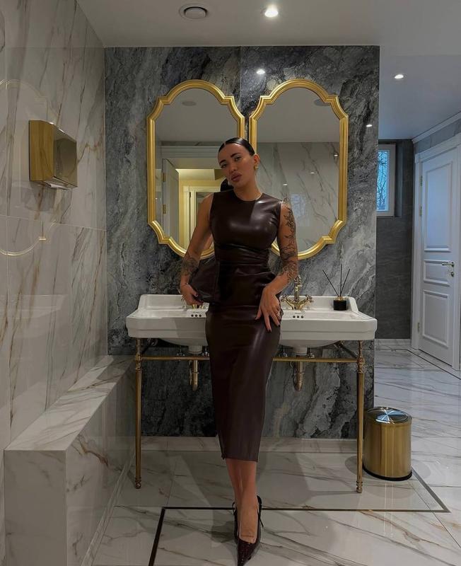 #Сукня Артикул: 803-422 Цвет: шоколад, черный Размер: S-M ; ML Материал: эко кожа Благодаря сборке очень удобна, ничего не перетягивает и при этом подчеркивает фигуру