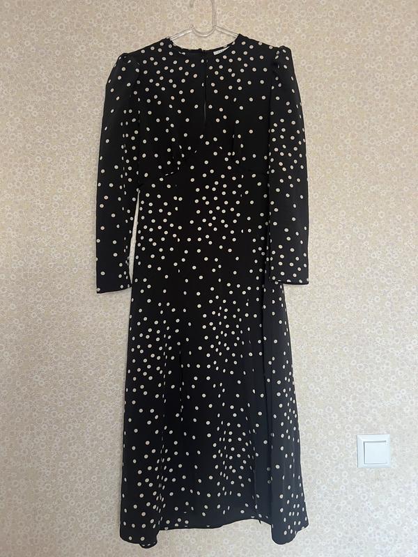 Гарна сукня у горох, попереду два розріза, капля розріз на грудях та позаду на спинці, позаду замочок, вишукана та елегантна Заміри: довжина 116 см, рукав 56 см, талія 36 см, плечі 35 см