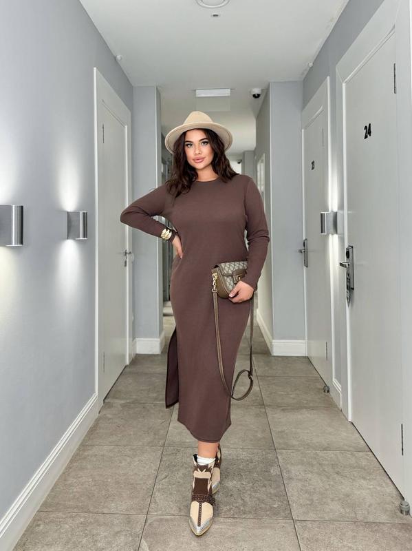 Женское платье-миди с разрезом на ноге с длинными рукавами в рубчик