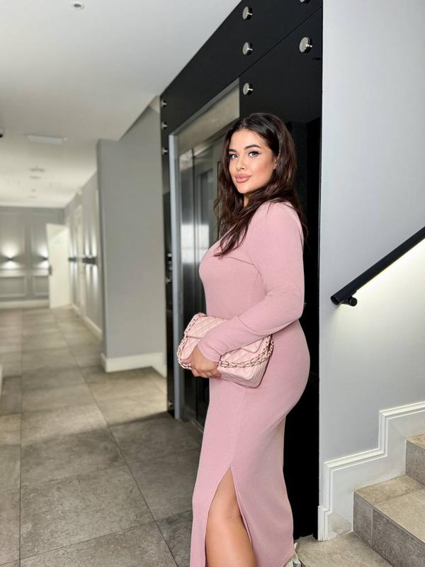Женское платье-миди с разрезом на ноге с длинными рукавами в рубчик