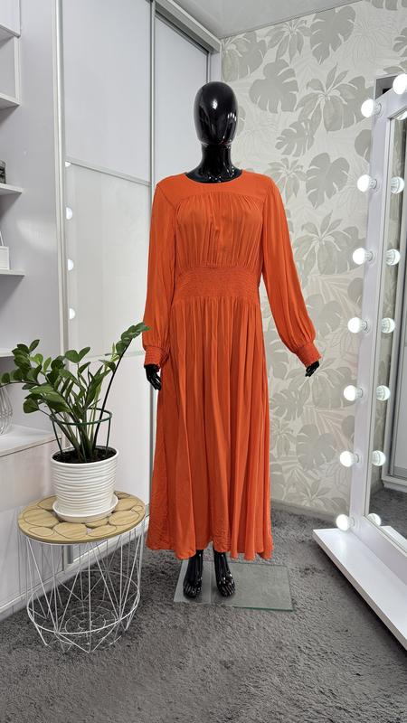 Красивое оранжевое платье-миди, р. 14-16. Стан идеален. В поясе широкая резинка. Ткань 100% вискоза. длина 130 см, длина до резинки 44 см. ог 116 см. от 86-104 см. ос 140 см. рукав 61 см.