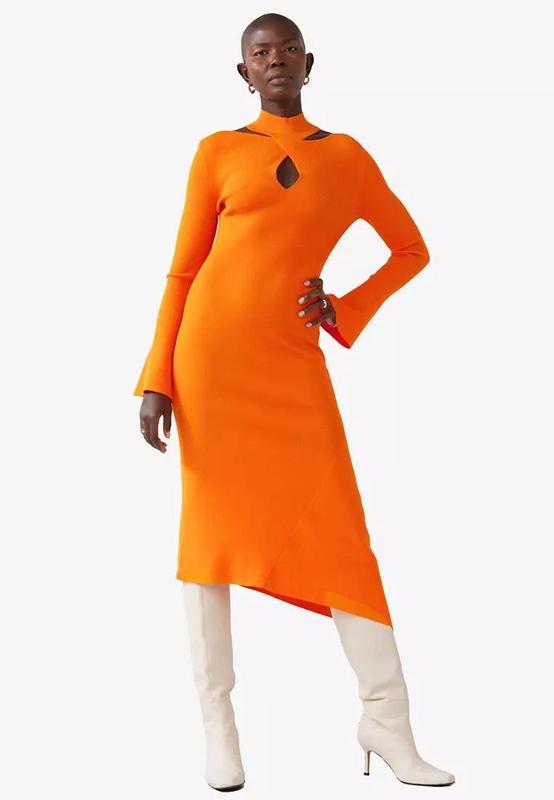П: Стильна, яскрава сукня міді в яскраво-оранжевому кольорі з ацетатної цупкої тканини в рубчик ,кінець рукавів кльош, стильна горловина та плечовий виріз, низ сукні на зуб в розмірі с-м 1126800-002
