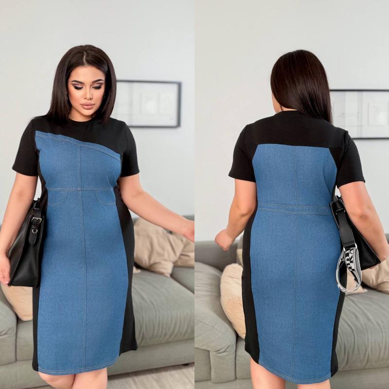 ■ Сукня ■ Модель 0438 ■ Цена 800 грн ■ Тканина: трикотаж / джинс ■ Цвет: основа черная,джинс ■ Размер: 42-44,46-48, 50-52 ■ Описание: Платье на изображении представляет собой стильное и современное изделие, выполненное из комбинации материалов. Описание: Фасон: платье имеет приталенный крой, подчеркивающий фигуру. Длина платья доходит до колен. Материал: Верхняя часть платья выполнена из черного трикотажа, а основная часть – из светло-синего джинсового материала. Цветовая палитра: Комбинация черного и светло-синего цветов, что делает платье универсальным и подходящим для различных случаев. Это платье подходит для повседневной носки и для неформальных мероприятий. Его можно сочетать с кедами для повседневного образа или с каблуками для создания более элегантного стиля.импер