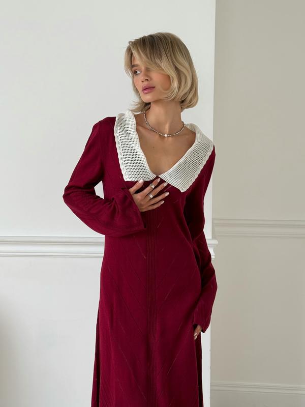Хлопковое вязаное платье миди с акцентным воротником, ажурное элегантное платье