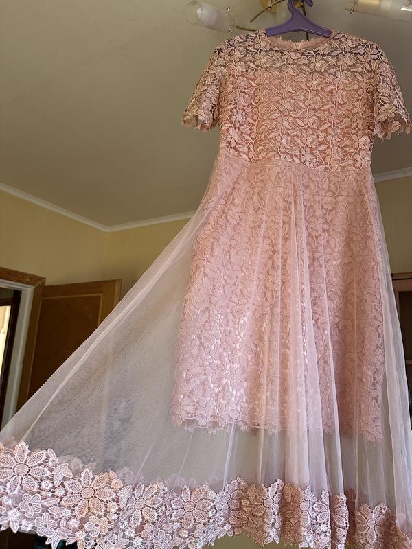 Розовое платье с сеткой. Для праздничных событий, нарядно и красиво смотрится. Состоит из трех видов ткани розовая гладкая, далее объемные цветы, и низ платья сеточка. Очень удобная. Имеет дефект на сеточке сзади, в самом низу. Наделась один раз на свадьбу. Размер Л, замеры Пив объем груди - 50см, полуобъем талии - 42см, полуобъем бедр - 54см Если необходимы дополнительные фото или информация, отправлю.