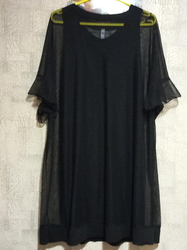 Состояние новой вещи. Полиэстровое полупрозрачное платье свободного кроя, плетеное переходит в рукав,созданное воланом, с внутренней эластичной майкой ( 50% полиэстер, 45% вискоза, 5% эластан). Сделан в Италии, размер не указан, подойдет на наш 48-52. Длина-95см, ширина под рукавами-71см, ширина по низу-71см.