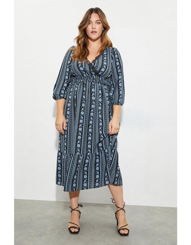 Платье миди в цветочный принт с кружевом, талия завышенная, рукав укороченный, низ платья ярусный, ткань плотная, не просвечивает. Новое, без дефектов, размер 18 длина 122 см плечи 38 см (рукав заходит на плечо) ПОГ 55 см + Укромность до 65 см НОТ 41-61 см (резинка) НОС 71 см длина рукава 49 см ПО пройма/бицепс 26 см/23,5 см