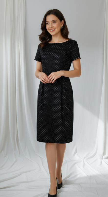 98 % бавовна. Приталегающее платье миди черного цвета с принтом в мелкий треугольник. Ткань плотная, тянется, в составе эластан. Вырез горловины скруглен. На груди вытачки. Верх отрезной по линии талии, широкий пояс. Из пояса две складки, формирующие бедра. Низ-юбка карандаш. Сзади скрытая молния. Застегивается вдоль спины, ниже линии талии. Внизу небольшой разрез. Рукава короткие. Платье на подкладке, тоже тянется( полиэстер). Размер 38. Плечи 38 Груди 48 Пояс 42 Стегна 52 Ширина внизу 43 Длина 91 Приглашаю просмотреть другие Мои объявления. Каждый день новинки. Благодарю за подписку. Выбирая несколько вещей, отправляем одной посылкой.