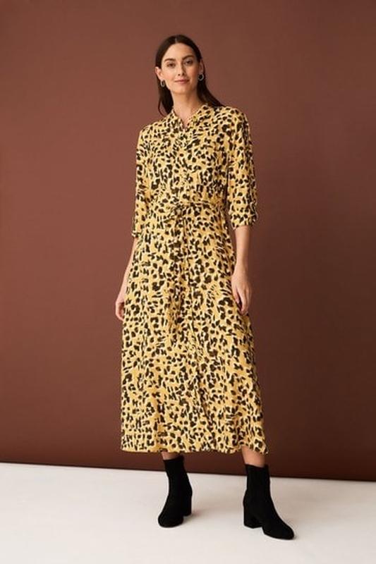Стильное меже платье в леопардовый принт F&F. Размер 8. В очень хорошем состоянии без дефектов. К низу на пуговицах, на комоде есть кармашек, имеет пояска, рукав 3/4. Ткань плотная вискоза из переработанного пластика, не тянется. Замеры груди 45см, талия 37см, бедра 55см, длина от плеча 120см