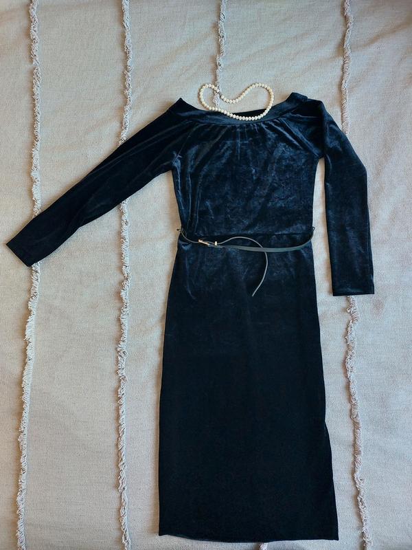 Изысканное бархатистое платье по фигуре черно-синего цвета, может быть в классическом ансамбле с обувью на каблуке, или в современном образе с сапогами на грубой подошве с оверсайз жакетом или косой. Вырез лодочкой, выглядит очень элегантно. Размер на наборе L, замеры на фото, очень эластичная, красиво тянется. Новая, с биркой. Обмену, возврат нет. Є безпечна оплата.