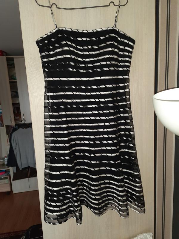 Новое праздничное платье от британского бренда Linea, на тонких регулируемых бретелях, размер 14. Черная ткань- сетка прошита атласными лентами. Топ в груди уплотненный чашками, по краю силикон, застежка молния. Полуобхват груди 45 см Длина по спинке без бретелей 79 см