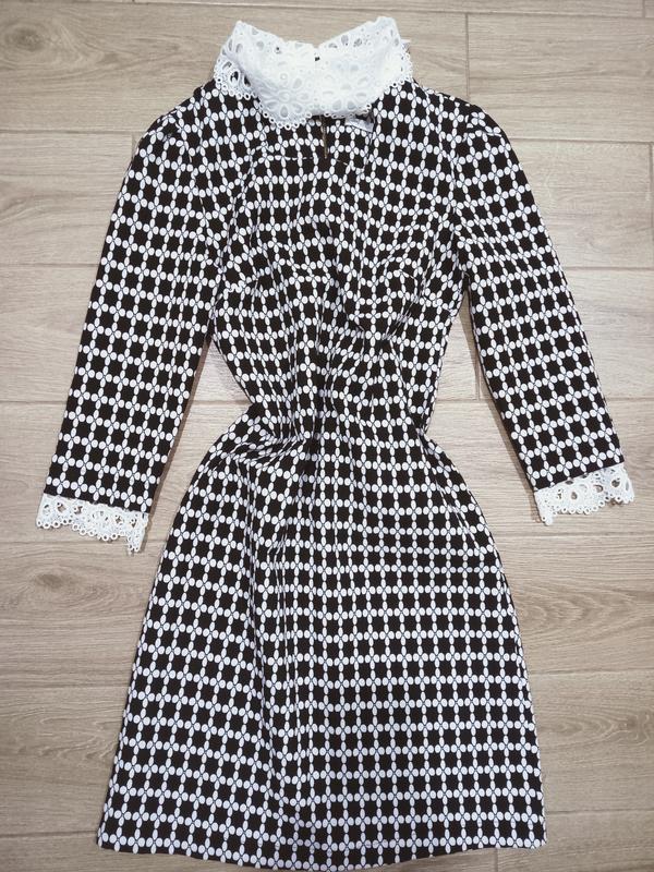 Элегантное сдержанное платье длины миди. Манжеты и горловина декорированы плотным кружевом. Горловина спереди имеет вырез. Воротник стойка. Рукава фонарики. По спинке длинная молния. Ткань красиво держит форму. Крой приталенный, к низу чуточку шире. Подойдет для стройной хрупкой леди. Красивая вещь на праздничный вечер, торжественное событие. Бренд - PHARDI Размер - 10 / ЕВР 38/ S-M Плечи - 36 ПОГ - 42 + виточки ПОТ -37 ПОБ - 44 Рукав от горловины - 55-56 Длина по спине - 87 Состояние - идеальный Эффекты – утраченная жемчужинка из пуговицы сзади на вороте.