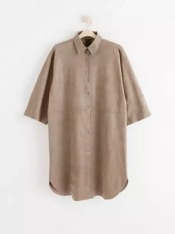 грудь 64 бедра 64 длина 102 базовое платье рубашка из экозамша цвета тауп. размер указан Л, по меркам на Л будет как на каталожном фото, мерки позволяют до 54 размера этикетки срезаны, в цене учтено