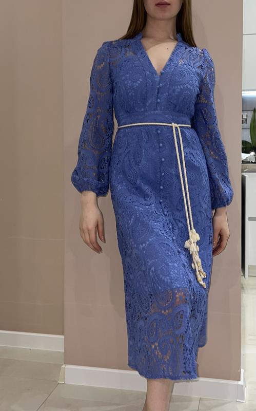 Очень красивое кружевное платье с декоративным поясом, в голубом цвете с декоративными пуговицами по всей длине платья Длина рукава 60 см Полу обхват талии 35 см Длина 120см