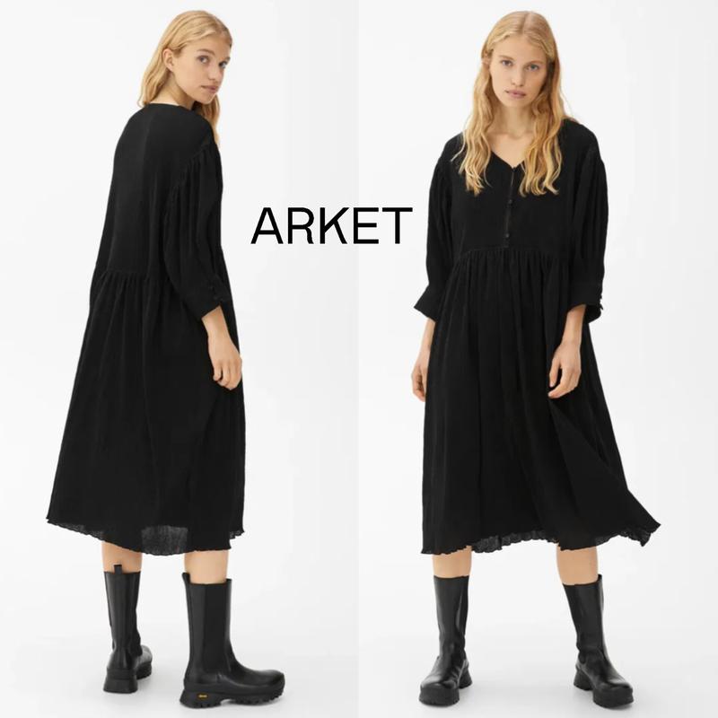 Описание платья ARKET : Это платье – настоящее воплощение элегантной легкости и безупречного стиля. Изготовлена из воздушной жатой ткани, она дарит ощущение свободы и комфорта. Оверсайз-крой добавляет современной непринужденности, а свободный силуэт отлично подходит любому типу фигуры. Лиф платья украшен V-образным вырезом с застежкой на пуговицах, что добавляет женственности и изысканности. Рукава-баллоны длиной 3⁄4 создают воздушный объем и завершаются стильными манжетами. Заниженная линия плеча подчеркивает трендовый крой, а свободный низ придает платья романтичный шарм. Замеры: Длина: 112 см Грудь: 60 см Талия и бедра: свободный крой Рукав: ¾ Линия плеча: заниженная Размер: 38,на размер 40 также подойдет Преимущества: ✔ Стильный оверсайз-силуэт, не сковывающий движений ✔ Легкая и невесомая жатая ткань, идеальна для любого времени года ✔ V-образный вырез добавляет утонченности образу ✔ Рукава-баллоны и манжеты создают стильный акцент ✔ Универсальная черная классика – подходит и для повседневной носки, и для особых случаев ✔ Отлично комбинируется с ботинками, кроссовками или босоножками