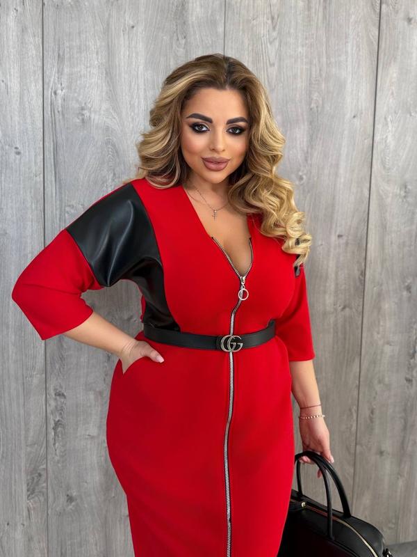 Платье Мод 102 Цена : 1450грн + пояс 100грн Ткань: креп-дайвинг + молния+ эко кожа Размер:,50-52,54-56,58-60 Цвет: черный, красный, электрик