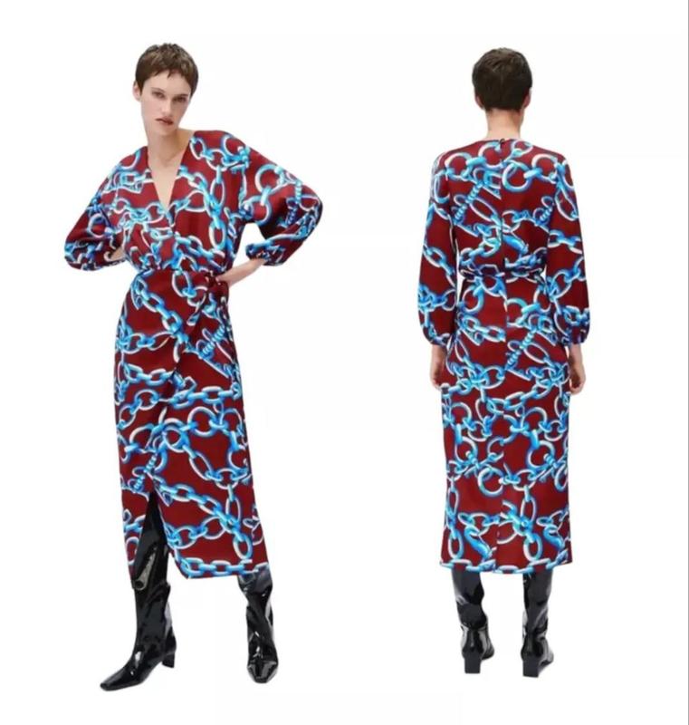 платье на запах На бордовом фоне бирюзовые цепи. V образный вырез - зону декольте, при этом зрительно удлиняет шею. очень стильное и приятное к телу Новое с бирками в наличии L размер и М размер Размер М Длина 127 см, под мышками 51 см, пот 39 см, поб около 57 см